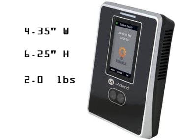 uAttend MN2000 is a facial recognition time clock designed for use with the uAttend cloud portal subscription. It is used to record employee punches by face scan, with RFID badge/key fob and PIN punch options as backups. Businesses choose this system to cut down on buddy punching, reduce manual time edits, and keep payroll moving with online approvals and exportable reports.