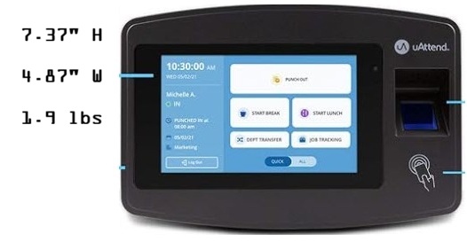 The uAttend JR2000 time clock is a cloud-based employee time and attendance system designed for businesses upgrading from manual time cards or older punch clocks. Employees can clock in using fingerprint recognition, RFID badges, or PIN entry, with punches immediately updating in the uAttend cloud portal for simplified payroll preparation and attendance tracking.